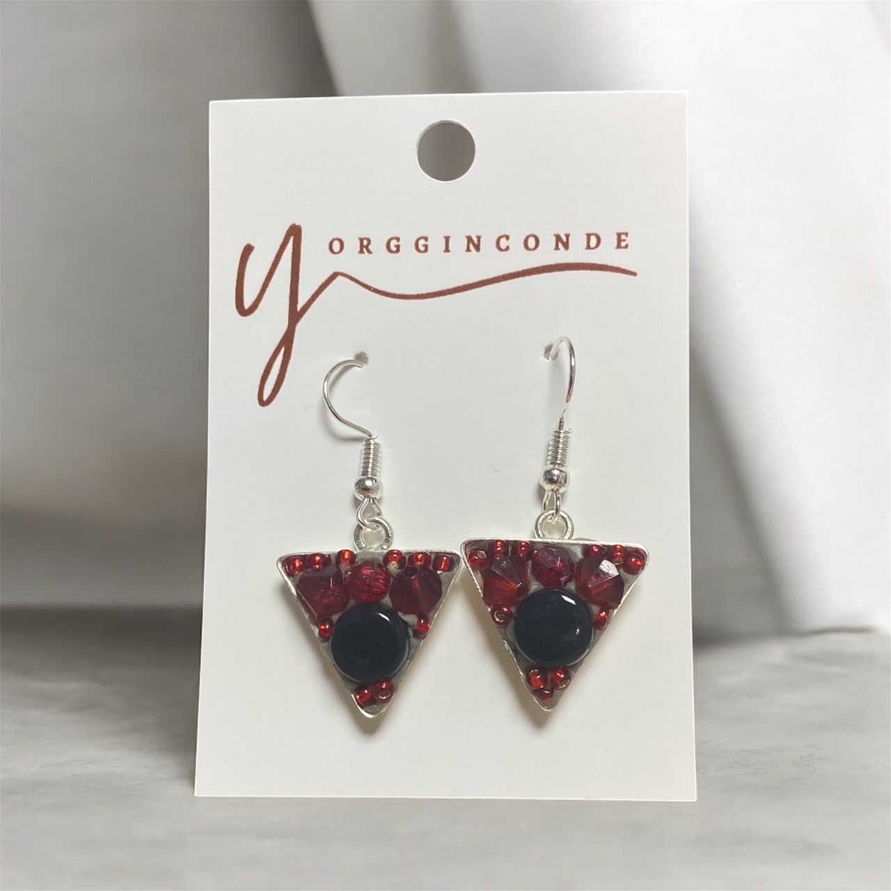 Bellos aretes en negro y rojo sobre bases revestidas en plata de alta calidad.