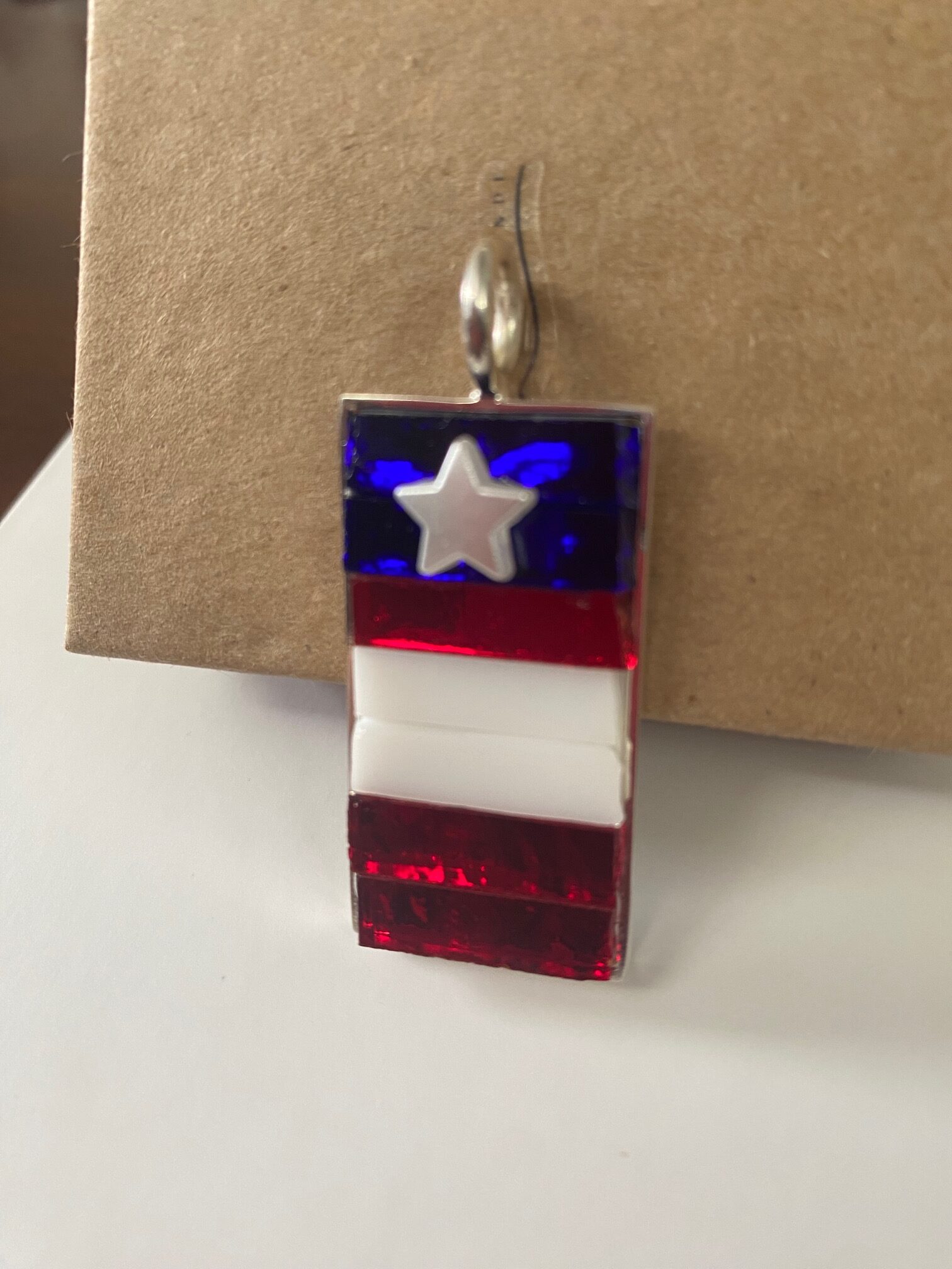 Este colgante evoca los colores de la bandera. Realizado totalmente en vidrio sobre base revestida en plata de alta calidad.