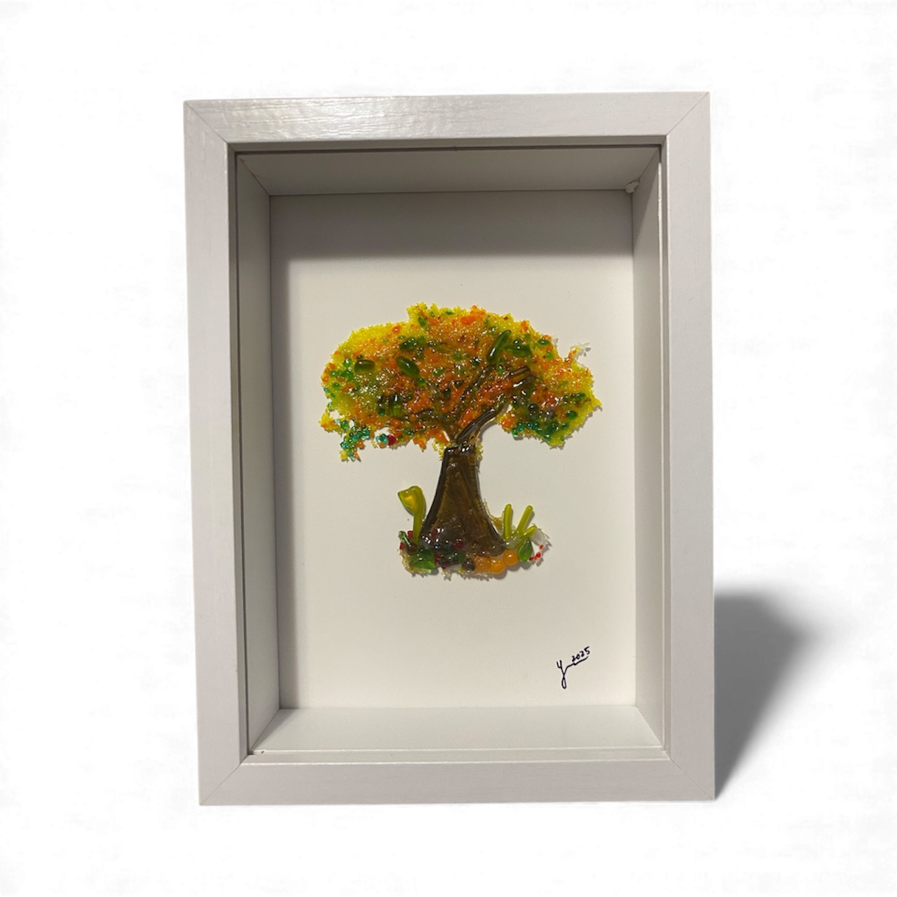 Diseño del flamboyán amarillo completamente en vidrio fundido. Mide 6″ x 8″, con su marco.