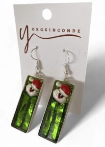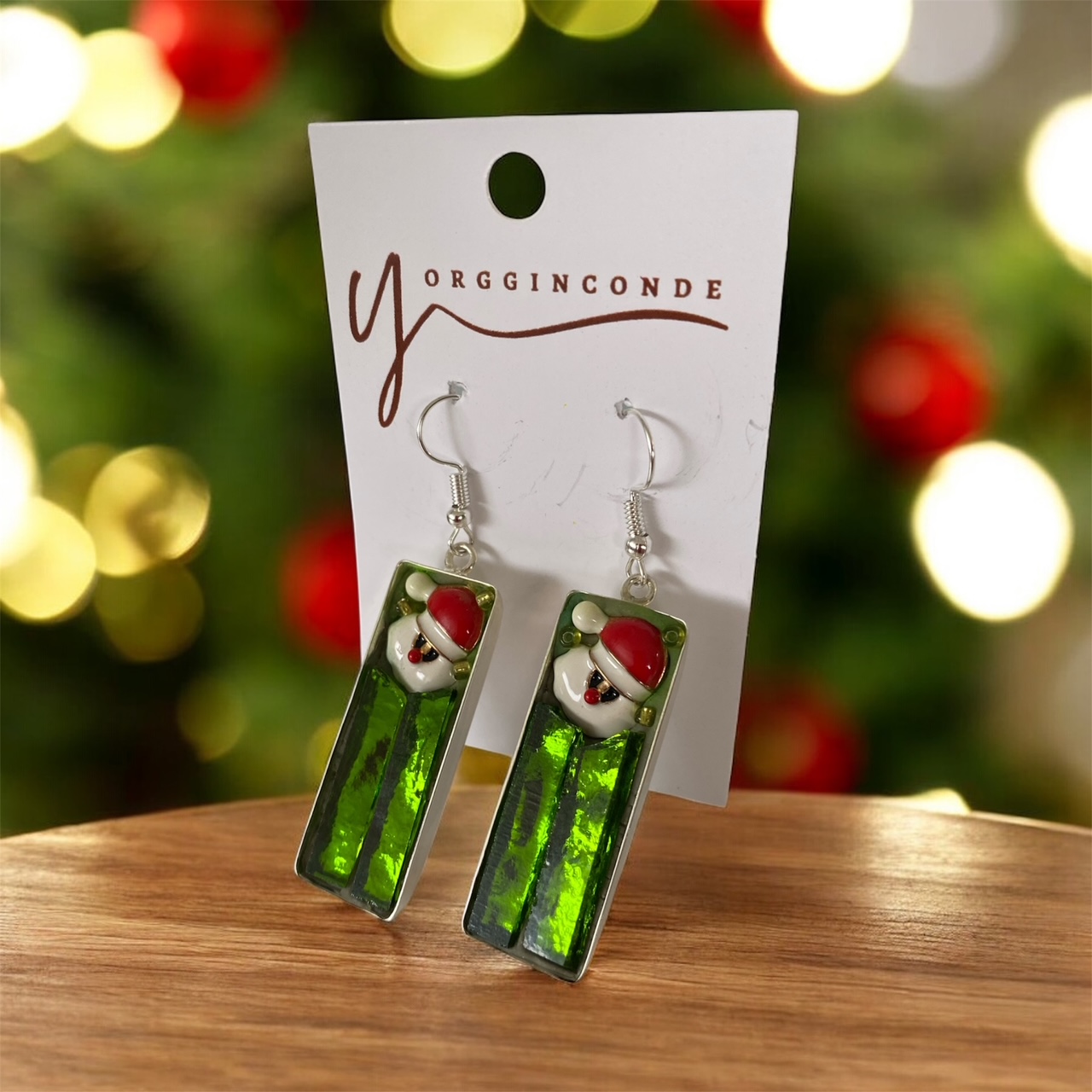 Aretes en bello cristal verde y la imagen de San Claus, sobre bases revestidas en plata de alta calidad.