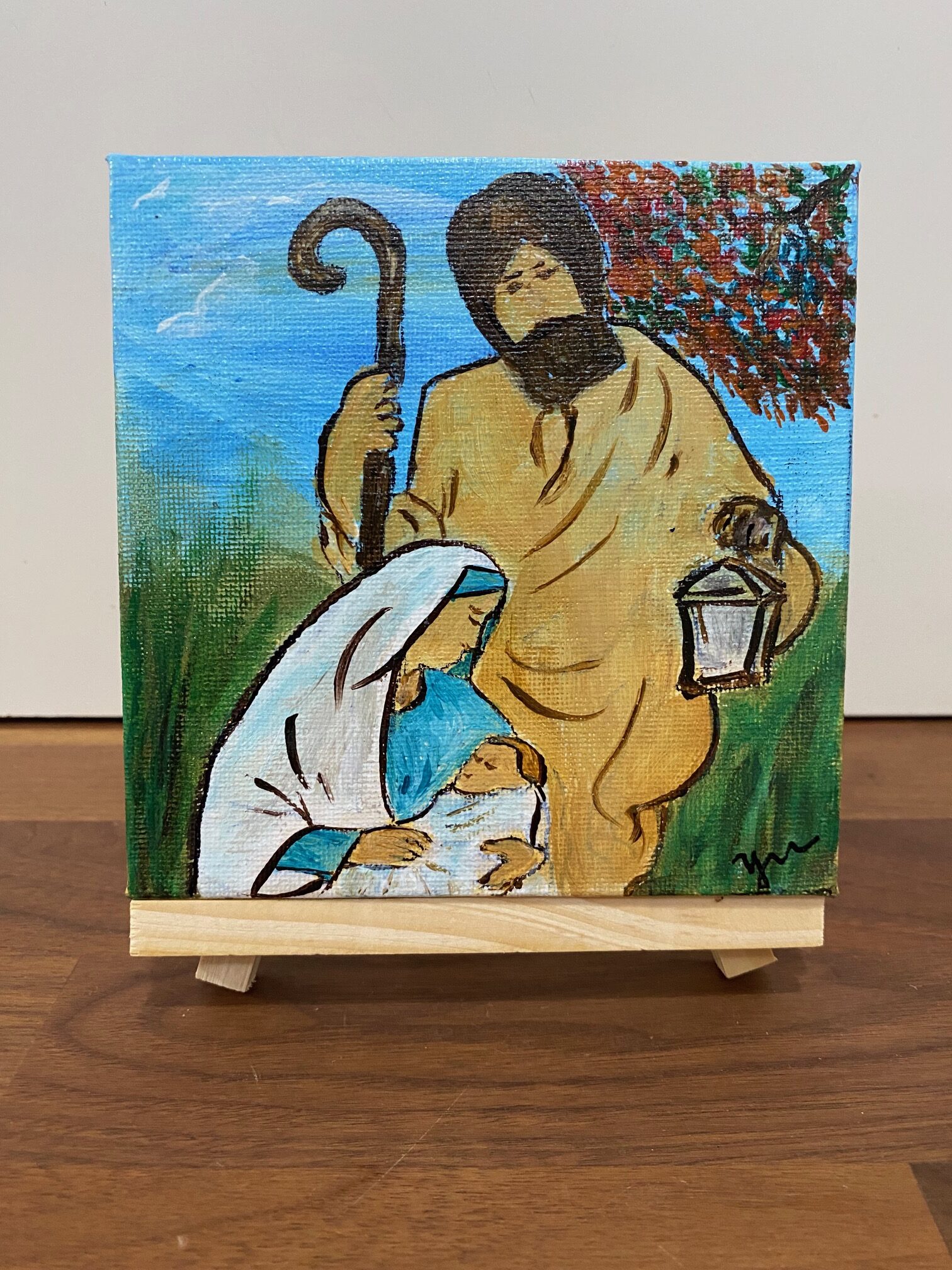 Esta hermosa pintura sobre canva mide 5″ x 5″. Incluye el caballete en madera para exhibirla.