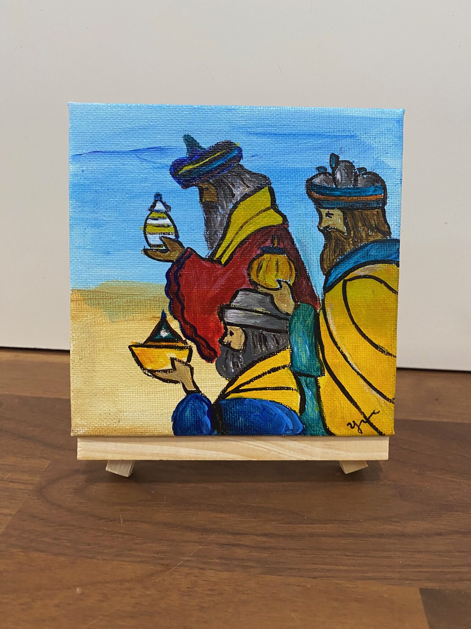 Preciosa pintura sobre canva de los Reyes. Mide 5″ x 5″. Incluye  su caballete en madera.