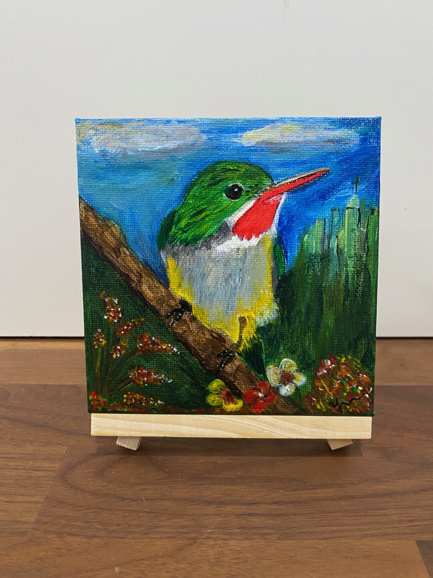 Hermosa ave endémica de Puerto Rico pintada sobre canva. Mide 5″ x 5″ e incluye el caballete en madera para exhibirla.