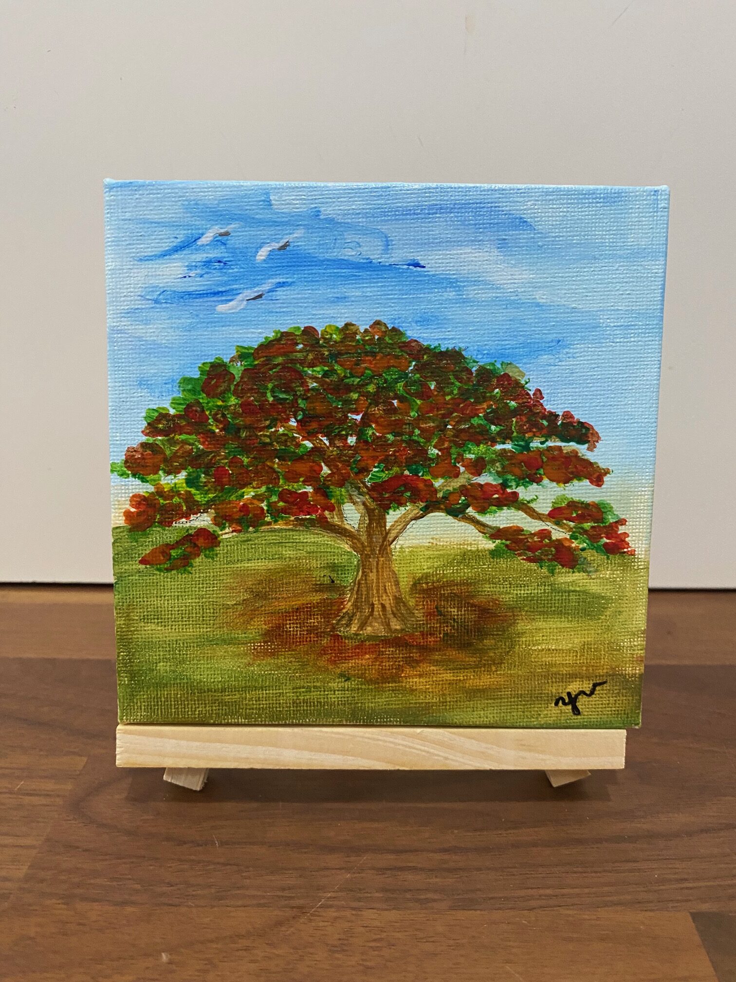 Bello flamboyán pintado sobre canva. Mide 5″ x 5″ e incluye el caballete par exhibirlo.