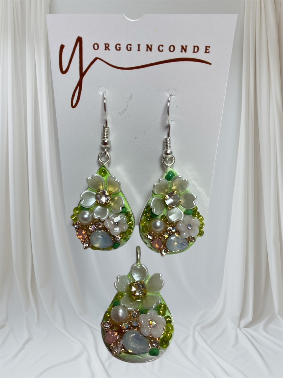 Precioso y elegante conjunto de aretes y colgante con fondo verde sobre bases revestidas en plata de excelente calidad.