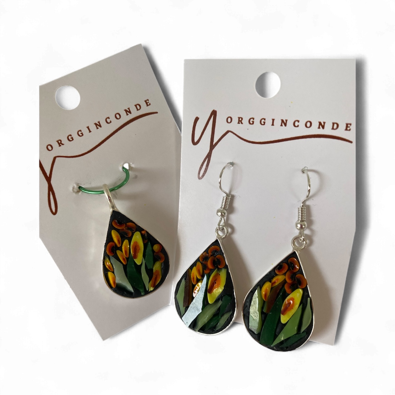 Super elegante conjunto de aretes y colgante en forma de pera realizado con filati italiano y stained glass sobre fondo negro. Las bases revestidas en plata de alta calidad.
