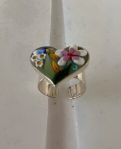 Bella sortija ajustable adornada con hermosas flores de filati italiano. La base está revestida en plata de alta calidad.