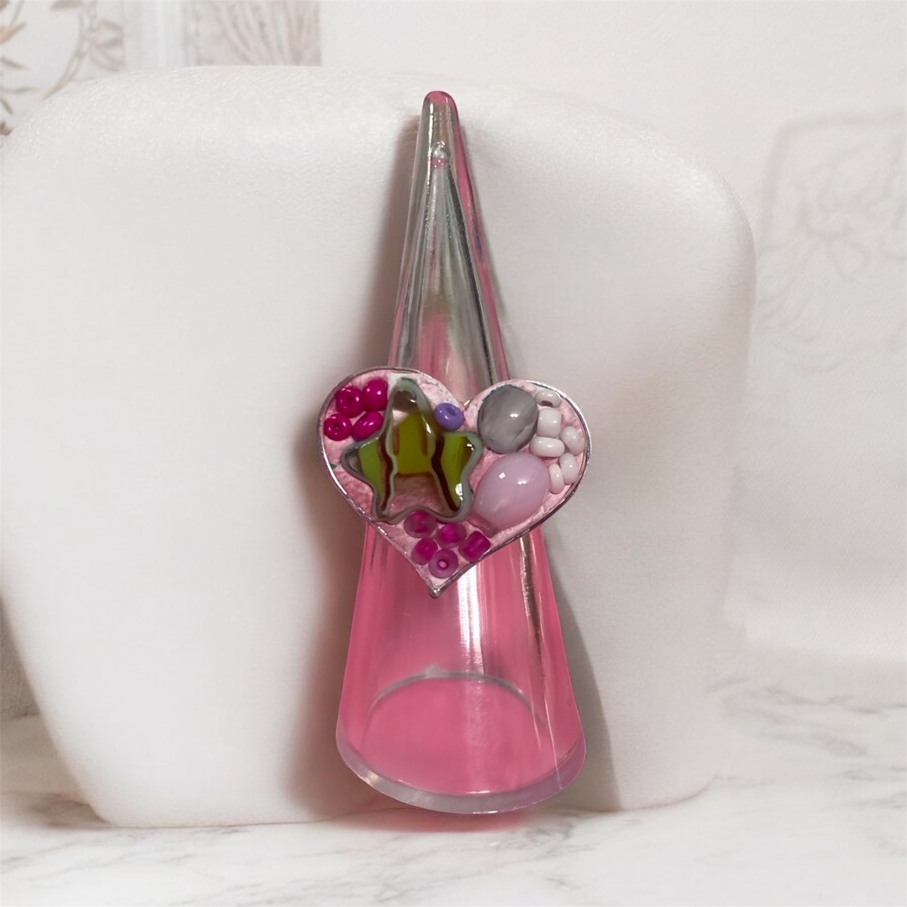 Una hermosa variación de la sortija realizada con murrine verde en forma de estrella y vidrio fundido. Base ajustable revestida en plata de alta calidad.