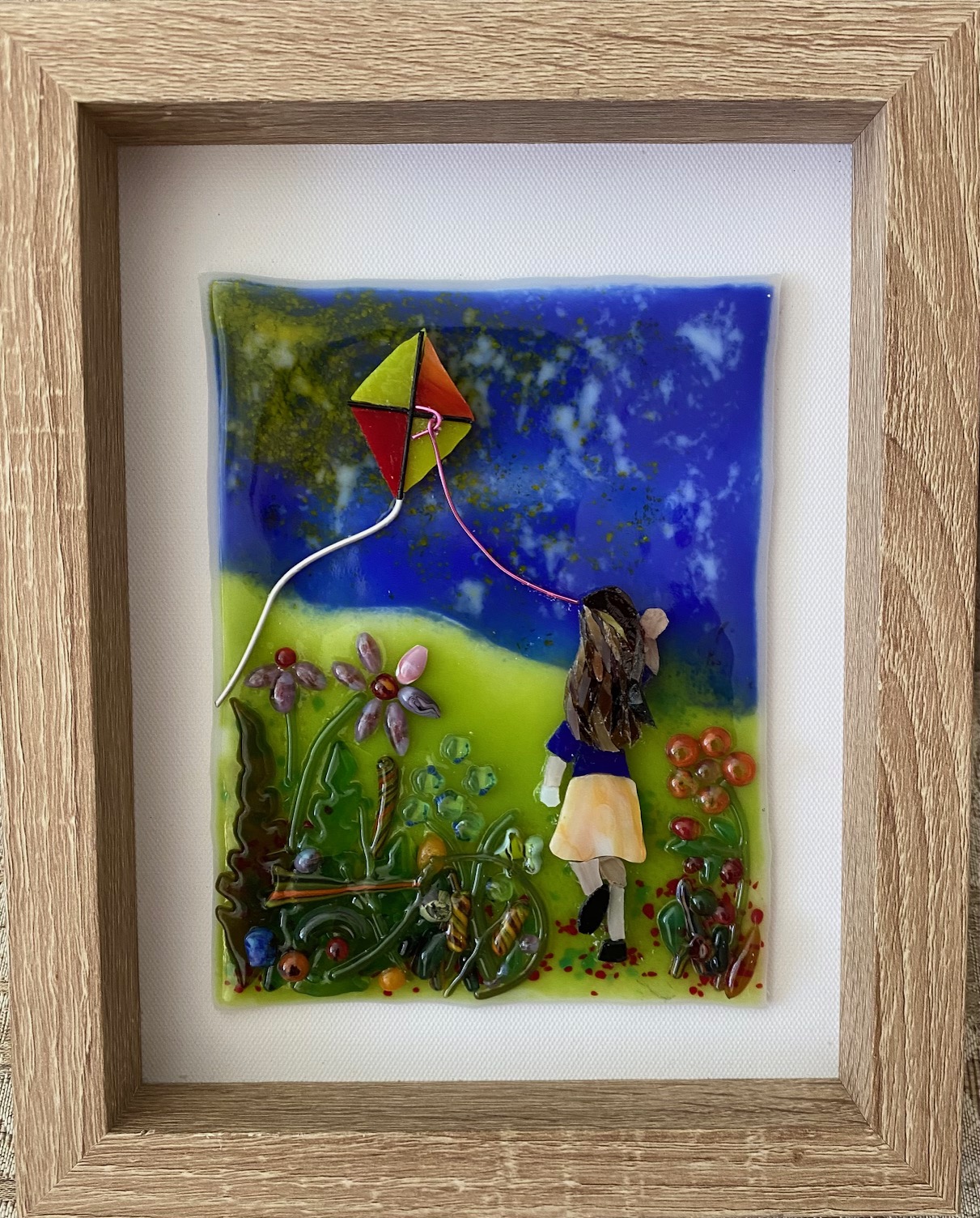 ¡Qué bonita tradición! Esta hermosa obra esta realizada con cristal fundido, «stained glass» y metal. Mide 8″ x 10″, enmarcada.